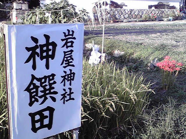 庄屋さんの家、と呼びたくなるような大きい古い家の横に田んぼがあり、一角はしめ縄がはられています。今日の目的地、岩屋神社とつながりがあるよう。