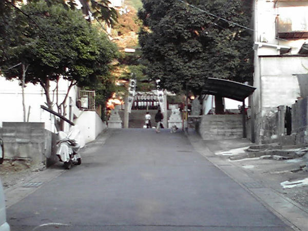 新奈良街道(信号がなく待たされます)を横切り、高速道路の下をくぐりますと、正面に階段。階段の上はまだ神社じゃありません。民家。