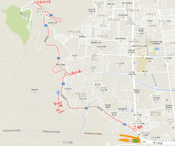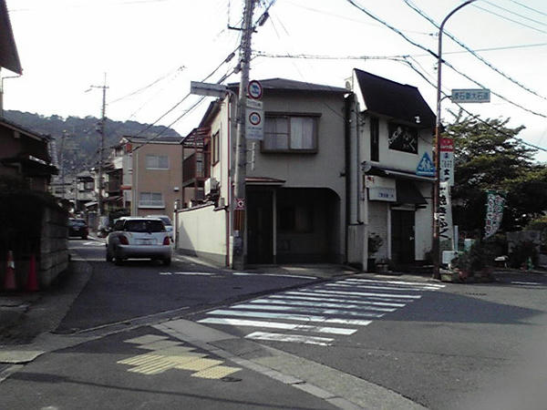 画面右上の標識が見えますでしょうか。右の道が新大石道(清水焼団地を通る道です)左側の山へ向かう坂になっているのが、滑石越えと言われる山越えの道です。醍醐寺へ向かう醍醐道のうち、このへんを滑石街道と呼ぶのかなと予想。江戸の古地図を見たら載っているかも… こんど借りてこよう。