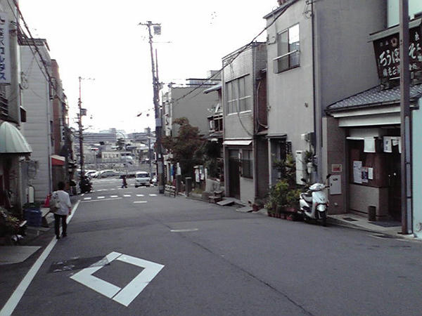 たらたらたらと降りてきて、急に道路が太くなり道の終わりです。このあたりは「今熊野」先にみえる大きな通りは東大路通りです。その向こうにJRの線路が見えます。