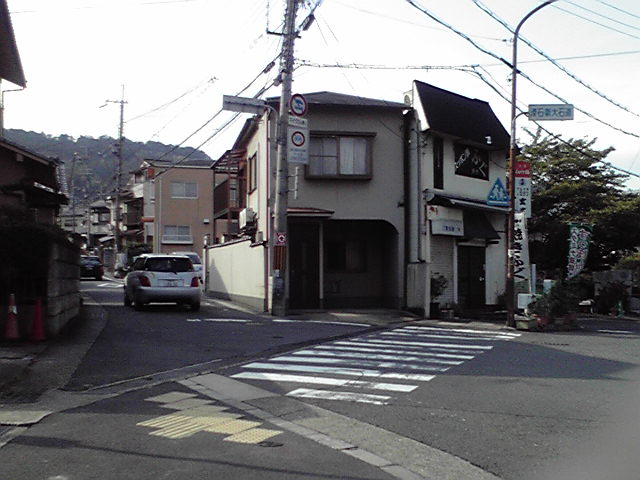 小休止。ここまですでにゆるやかな登りの道をずっとあるいてきているとのお知らせ。そうそう、京都は北が高くなっております。山科でもそう。たぶんそのおかげで北からの地下水が盆地に向かって広がりながらみやこを流れ潤してくれているのだと思うのです。古都の地の利ですね。地下鉄北山駅にある交差点から「鞍馬街道」もうほぼ一本道の北行きルートです。上らねばならない山が見えています。