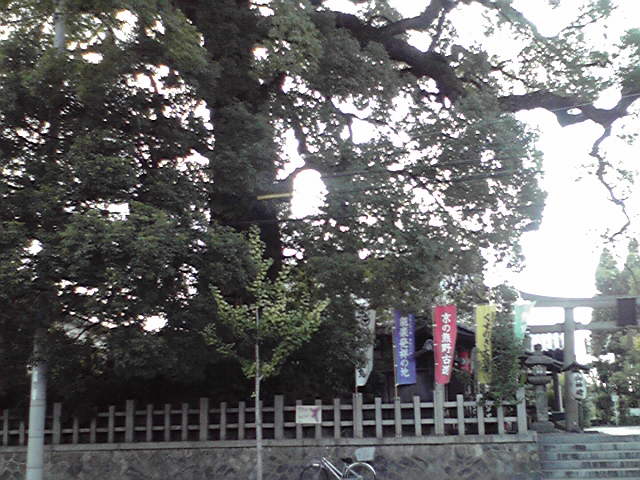 左(南)にアーケードを進みますとすぐ見えるのが新熊野神社。楠が目をひきます。