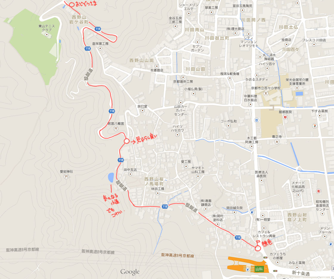 画面右上の標識が見えますでしょうか。右の道が新大石道(清水焼団地を通る道です)左側の山へ向かう坂になっているのが、滑石越えと言われる山越えの道です。醍醐寺へ向かう醍醐道のうち、このへんを滑石街道と呼ぶのかなと予想。江戸の古地図を見たら載っているかも… こんど借りてこよう。