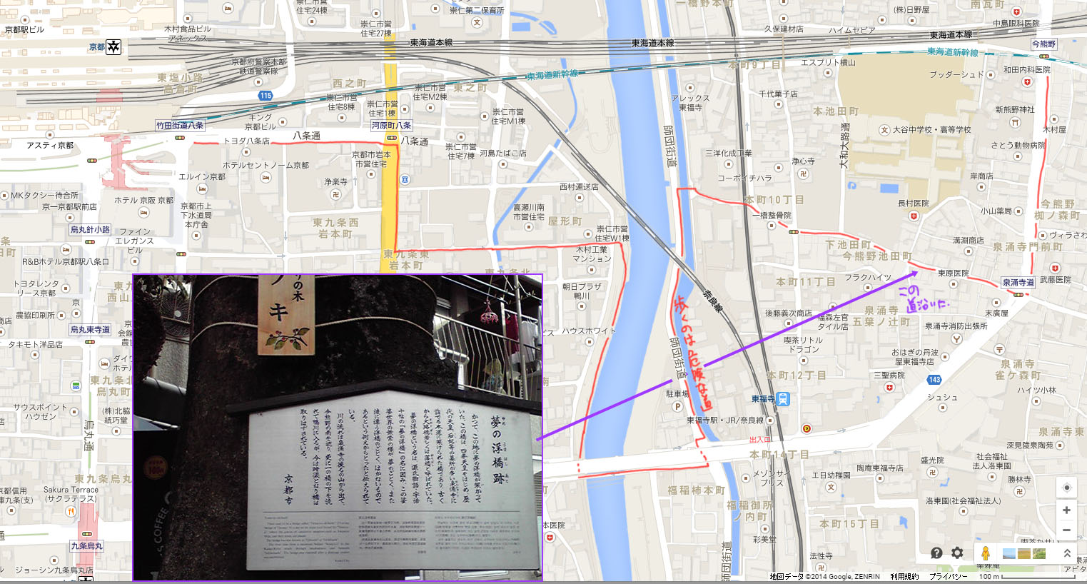 たらたらたらと降りてきて、急に道路が太くなり道の終わりです。このあたりは「今熊野」先にみえる大きな通りは東大路通りです。その向こうにJRの線路が見えます。