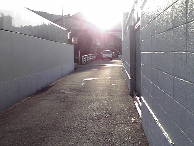西を向いて撮りました。スタートは橋のむこう。福田金属箔粉工業の間の道です。狭い。